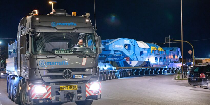 Per garantire la distribuzione del carico in modo sicuro e stabile, Marraffa ha utilizzato un Girder Bridge System su ben 42 assi, noto anche come trasporto con “spalle”. Si tratta di una tecnologia avanzata per il trasporto eccezionale di componenti pesanti, che consente di ripartire il peso su più assi e ridurre il carico su ogni punto di contatto con la strada.